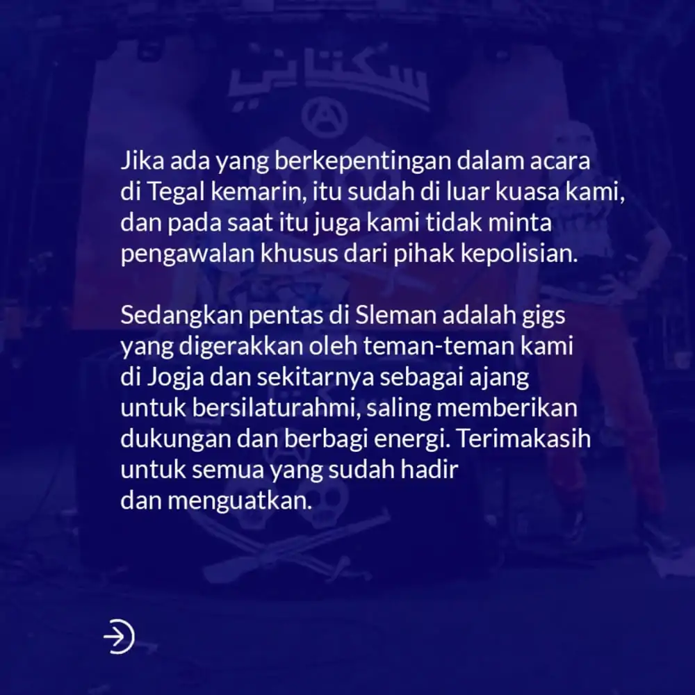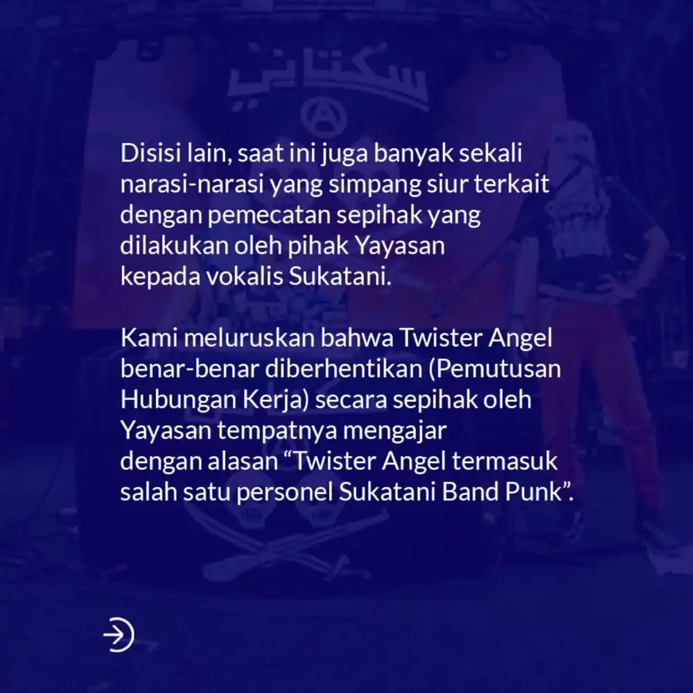 Pernyataan ini disampaikan melalui unggahan terbaru di akun Instagram resmi mereka, @sukatani.band. Dalam unggahan tersebut, Sukatani memastikan bahwa dua personelnya, Muhammad Syifa Al Lufti alias Alectroguy dan Novi Citra Indriyati alias Twister Angel, dalam kondisi baik.