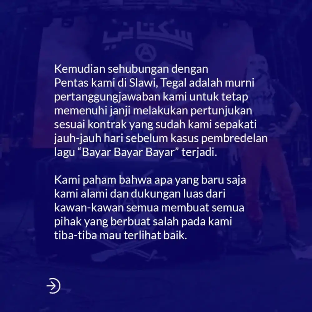 Namun, mereka juga mengungkap adanya tekanan dan intimidasi dari oknum Kepolisian terkait lagu Bayar Bayar Bayar yang membuat mereka harus mengunggah video klarifikasi beberapa waktu lalu.